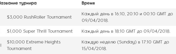 Также в рамках данной акции проводятся еще 2 дополнительных турнира: Super Thrill Tournament с призовым фондом $1,000 и Extreme Heights Tournament с гарантией $10,000. Расписание мероприятий: