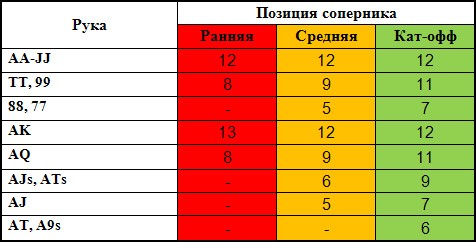 Как можно наблюдать, на этом месте допускается возможность разыгрывать повышением до 14% наборов. Рейз стоит совершать величиной в 3 ББ. На средней позиции – 15% с идентичной величиной повышений текущей ставки: