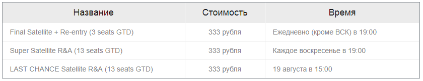 В частности, допускается шанс попасть на чемпионат посредством входных билетов или квалификационного отбора за 333 RUB. Для этого необходимо просто выполнять каждый день определенные задания. Расписание сателлитов: