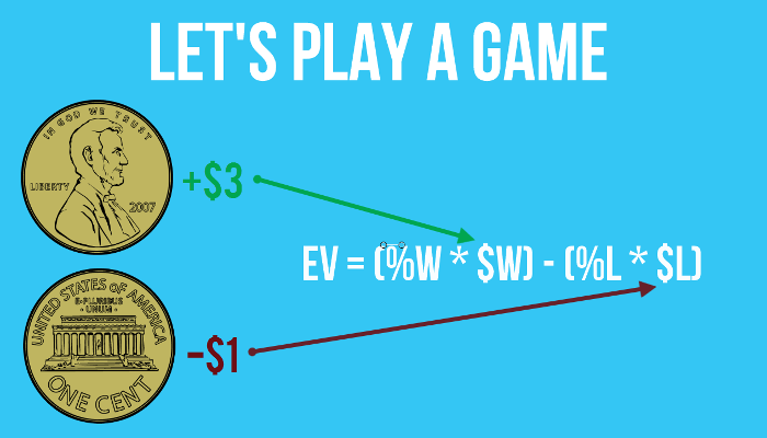 Например, вы должны совершить ставку величиной $5. Представим, что вы выигрываете: $2 (призовые) – $5 (ставка) = $20, а второй раз – терпите неудачу: $0 – $5 = – $5. Таким образом, математическое ожидание EV составляет $20 + (- $5) = $15. Иными словами, это значение по-прежнему является положительным, которое в случае 150, 1500 либо 75.000 сыгранных партий принесет стабильную прибыль.