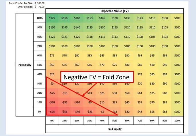 Сегодня есть специальная формула для высчитывания этого показателя: EV = [EV(fold)] *[EV(call)]. Но опытные покеристы советуют начинающим игрокам именно оценивать фолд эквити, а не рассчитывать. Для максимализации результативности необходимо наличие двух оценок: низкой и высокой.