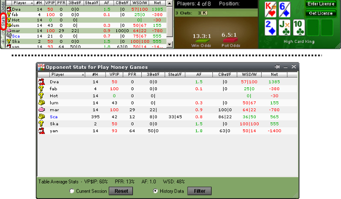- Статы. В отдельном окне выводится статистическая база сведений на оппонентов. Также допускается возможность в любое время ознакомиться данные о текущем игровом процессе и историю, имеющуюся в архиве. По окончании синхронизации программного обеспечения Холдем Индикатора с покерным приложением любого гемблинг заведения, софт в автоматическом режиме подключается к статистической базе покер-рума, применяя все имеющиеся сведения.