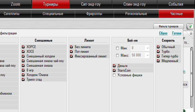 - Чемпионаты по покеру. На официальном сайте Покер Старс соревнования на виртуальные фишки в отдельный раздел не выделены. И дабы они отображались, следует сделать следующее: в личном кабинете скачиваемого софта необходимо зайти в фильтр чемпионатов и напротив раздела «Условные фишки» поставить галочку.