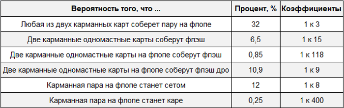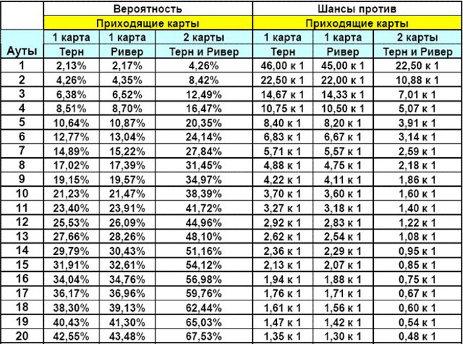 В такой таблице указано число ваших аутов, в соответствии с карманными картами, а рядом вероятность составления полноценной комбинации, которая указана в процентах. К примеру, у вас на руках пара A, а на стадии флопа находится еще один A. Какой процент, что вы сформируете каре тузов?