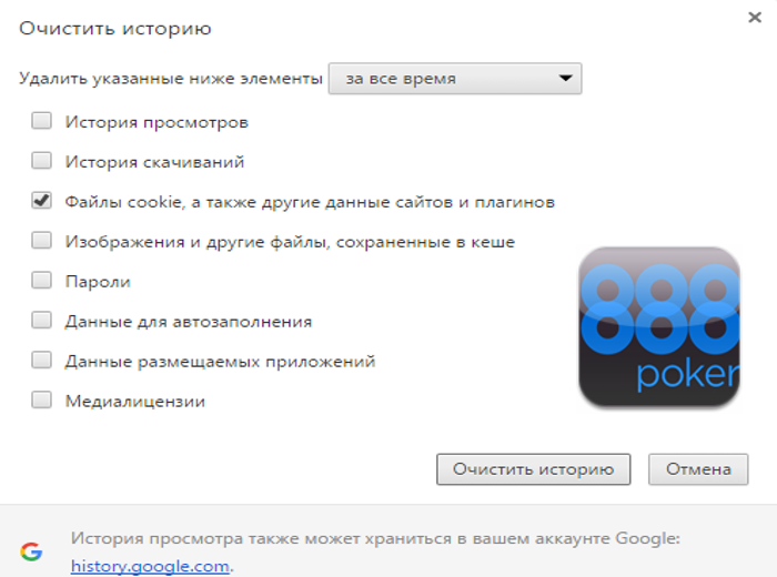 По окончании этих простых манипуляций, вас уже не сможет заподозрить в использование покерного клиента на ПК ни один рум и 888Покер не исключение. Даже если уверены на все 100%, что не заходили на официальный сайт покер комнаты и не пользовались скачиваемой программой, мы все же советуем почистить историю посещения страниц. Поскольку не исключено, что кто-то из родных или друзей уже использовали ваш компьютер/ноутбук для игры в покер на реальные деньги на 888Poker.