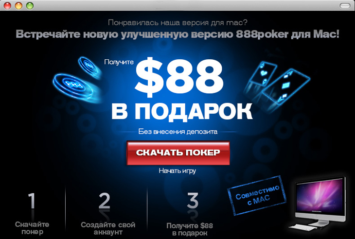 Игроки в покер на реальные деньги, проживающие на территории СНГ или России, могут бесплатно скачать приложение 888Poker на русском языке для ПК/ноутбука под управлением Windows и Mac, для мобильных гаджетов с операционной системой Android и iOS с официального сайта покер-рума. Скачиваемый клиент не требователен к ОС устройств и может быть установлен фактически на любой даже устаревший стационарный компьютер, смартфон или планшет. Также он предусматривает возможность «тонкой» настройки под личные привычки и предпочтение геймера, изменять язык, имеет поддержку мультитеблингового режима и многое другое. Всем новым пользователям положен приветственный бездепозитный бонус до $88.