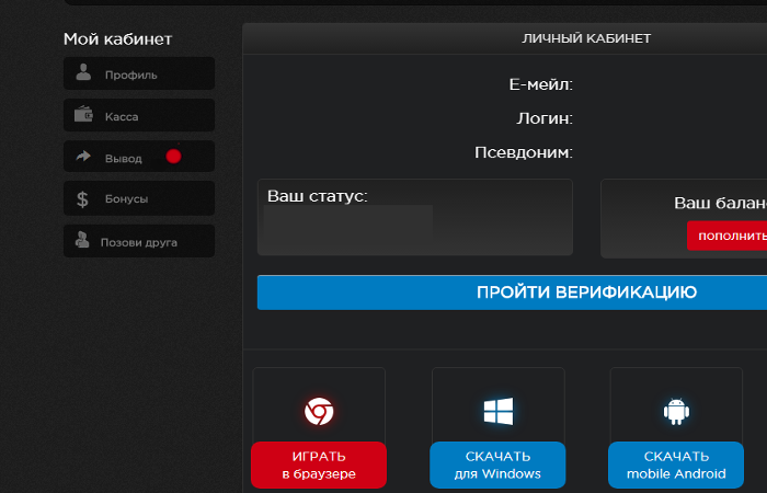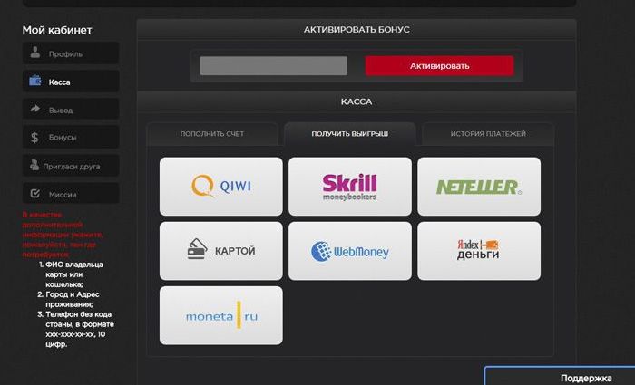Данный оператор не принимает и не рассматривает заявления на ввод выигрышей, которые были отправлены в саппорт через электронную почту. В личном кабинете во вкладке «Вывод» нужно выбрать платежный инструмент и указать желаемую сумму для снятия с игрового счета.
