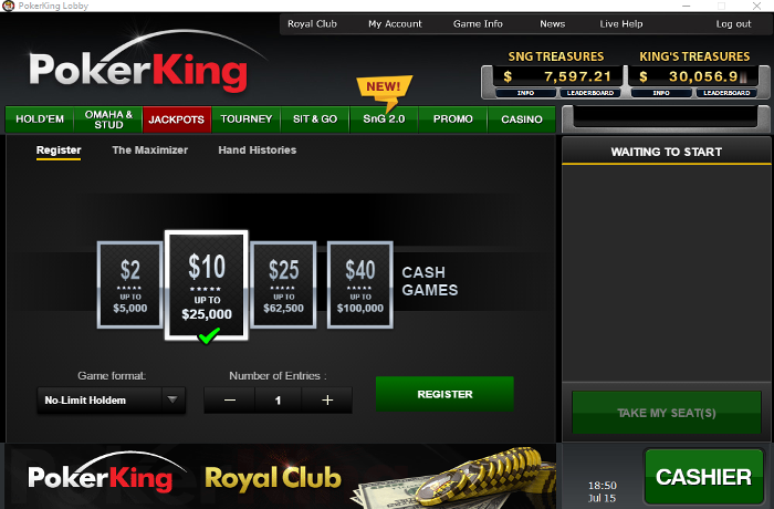 Например, пополнив игровой счет от $10 до $50, новые клиенты онлайн заведения могут рассчитывать на 100% бонус от суммы + $2 в качестве моментального поощрения. Тогда как, за депозиты от $100 до $499 начисляется $100 отыгрываемого бонуса, а также $10 мгновенно. Максимальный размер бонуса от Покер Кинг – 100% + $50 дополнительно, но при условии внесения денег на сумму от $500 до $777.