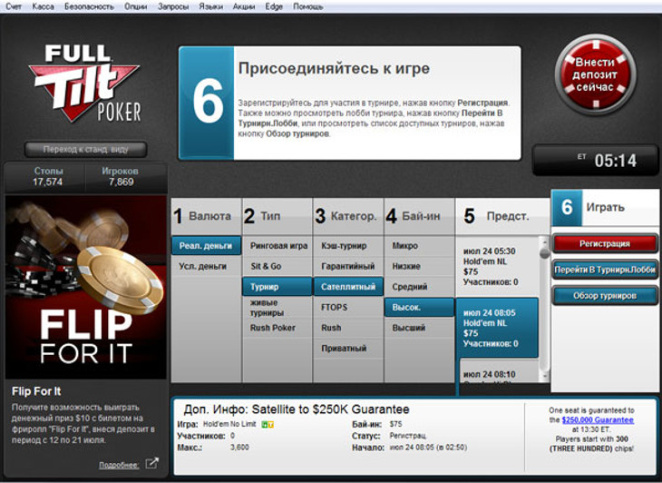 - Оптимальный выбор соревнований: Раш-турниры, 1-UP (Mульти-Энтри), «Воскресный дебош», «По запросу», «Фулл Тилт Мировая серия онлайн покера», «Мини FTOPS», «Daily Doubles» и другие.