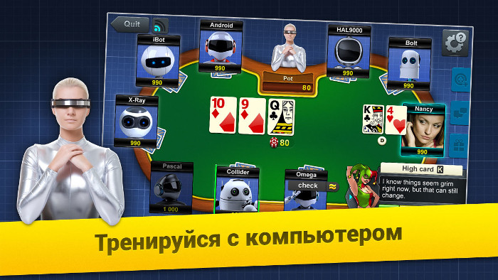 Для практических занятий в приложении предусмотрена оффлайн-игра, в рамках которой вы будете противостоять 8 забавным компьютерным ботам. Для совершения ставок отводится 1000 фишек, которые можно использовать исключительно в тренировочном режиме.