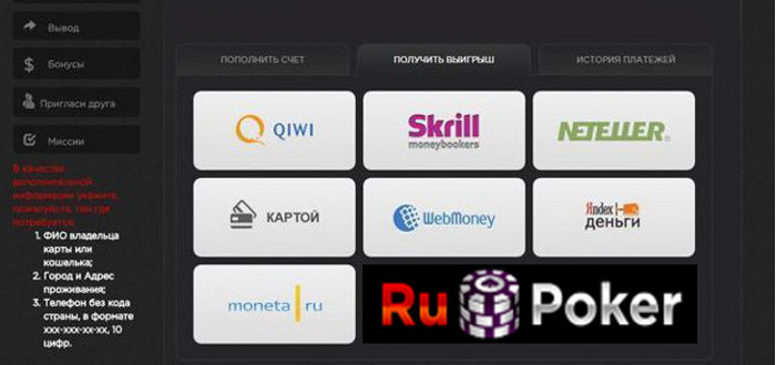 Для игры в RuPoker на реальные деньги, на официальном сайте покер-рума предоставлено более 15 распространенных сервисов платежей, но учитывайте, что некоторые из них предназначаются только для пополнения. Для вывода можно использовать: банковские карты Visa и MasterCard, электронные кошельки: Монета.ру, Скрилл, Вебмани, Нетеллер и Яндекс.Деньги.