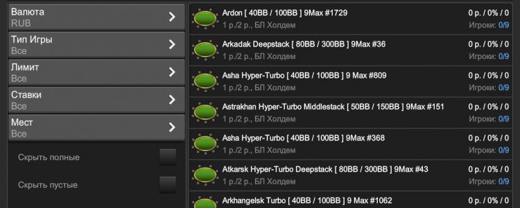 Чтобы сыграть за кэш-столом, достаточно перейти во вкладку «Игры». Здесь вам потребуется указать валюту, тип игры, желаемые лимиты и размеры ставок, количество игроков. После чего под эти критерии будут подобраны подходящие столы. Вам лишь останется сесть за один из них.