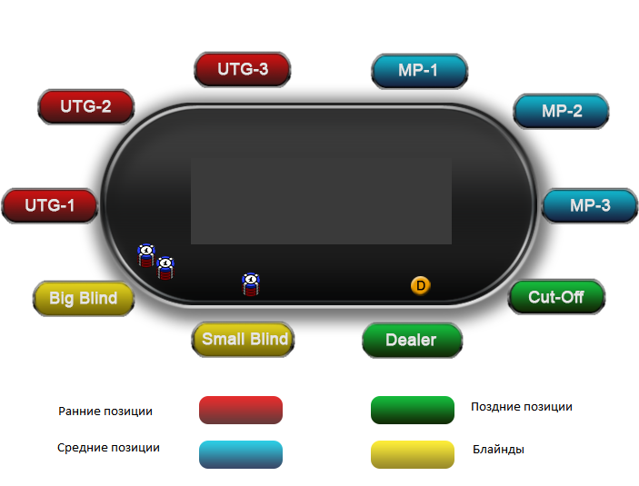 Поэтому действие с одинаковыми руками способно оказаться отличительным для каждой конкретной ситуации и позиции. Вы должны научиться высчитывать на какой позиции за столом пребываете в текущий момент. В этом вам поможет иллюстрированная схема, демонстрирующая позиции для стола с 10 участниками.