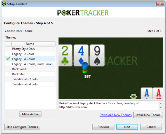 Вновь переключаемся к общему настраиванию Покер Трекер 4. Теперь это будет зрительная составляющая. Для этого вы должны выбрать предпочитаемый внешний вид карт в реплеере и тему игрового стола. В стандартном варианте выбор крайне маленький, однако, в сети можно отыскать огромное количество иных тем, каждой из которой присущи свои уникальные особенности.