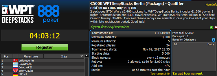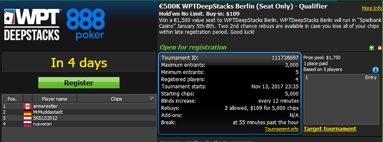 Данное партнерство посвящено к началу 2018 года. Ведь именно в следующем году в Германии, на предстоящем первом этапе XVI серии — WPT European Championship, первыми будут играть клиенты 888Poker, которые в рамках онлайн отборов стали обладателями пропусков для участия в Main Event.
